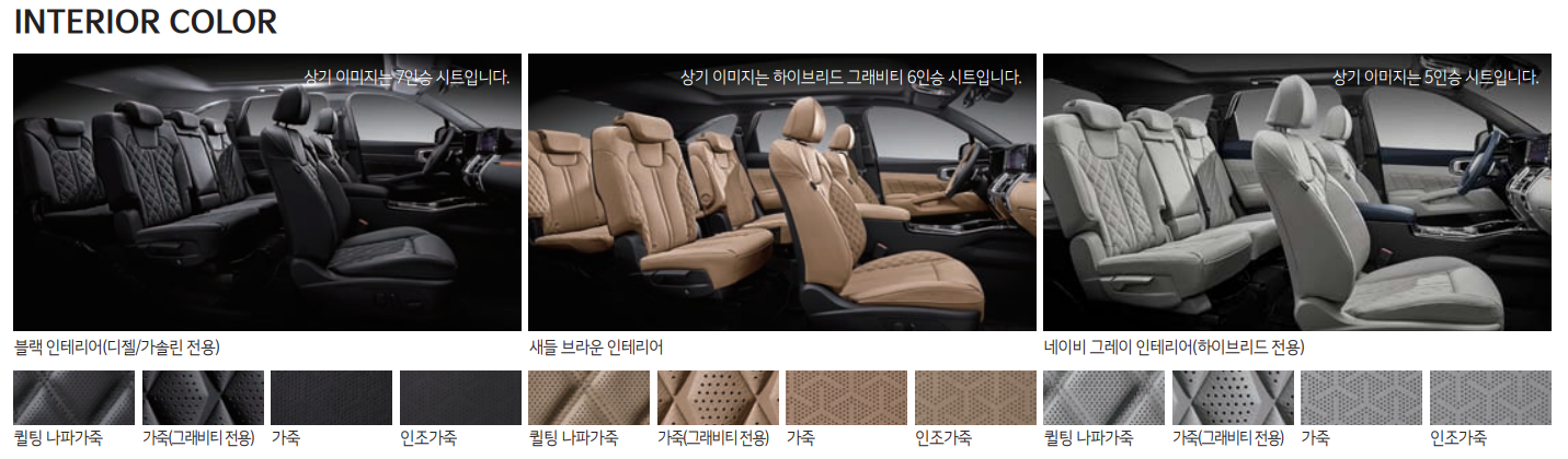 | 2열 독립시트(슬라이딩, 리클라이닝) 3열 5:5 폴딩시트(유아용 시트 고정장치) 2열 원터치 워크인 후석 매뉴얼 에어컨(후석 보조 에어컨 필터 포함) 3열 USB 단자(충전용) 퀼팅 나파가죽시트 |
