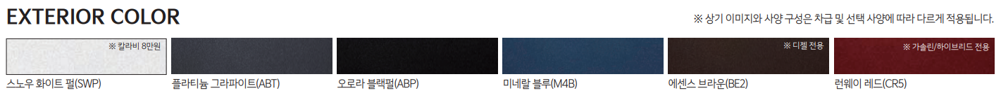 | 235/65R17타이어&전면가공 휠 LED 헤드램프 LED DRL LED 포그램프 LED 리피터 일체형 아웃사이드 미러(전동접이, 전동조절, 열선) LED 리어 콤비네이션램프 리어 LED 턴시그널램프 루프랙 에어로타입 와이퍼 윈드쉴드 이중접합 차음 글라스 |
