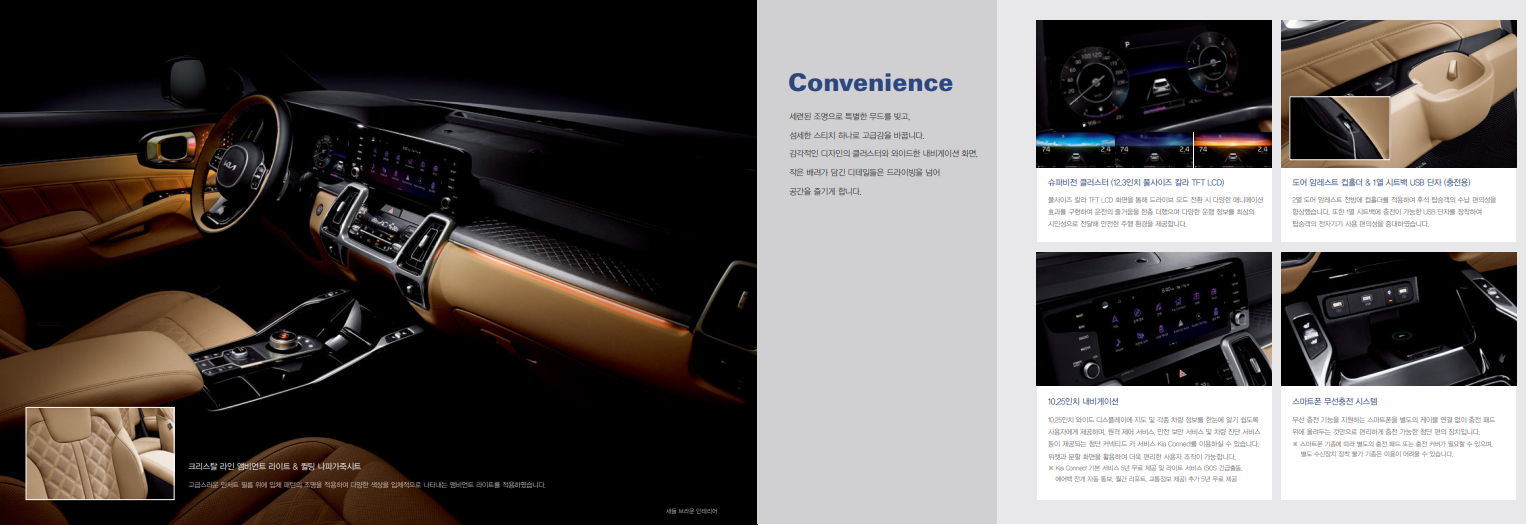 | 스마트폰 무선 충전시스템 기아 디지털 키 터치타입 아웃사이드 도어핸들 빌트인 캠(주행중 영상기록 장치) 보조 배터리 전자식 변속 다이얼(SBW) 패들 쉬프트 |