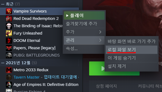 Vampire Survivors를 우클릭한 뒤,