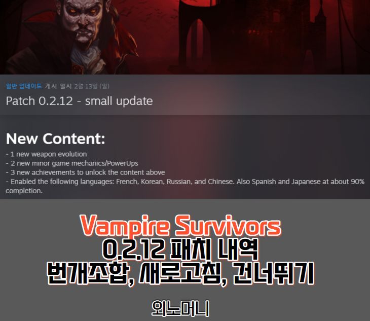 뱀파이어 서바이버즈 (Vampire Survivors) 0.2.12패치. 공식 한글 지원, 번개 고리 조합, 업적추가, 새로고침/건너뛰기 시스템 추가.