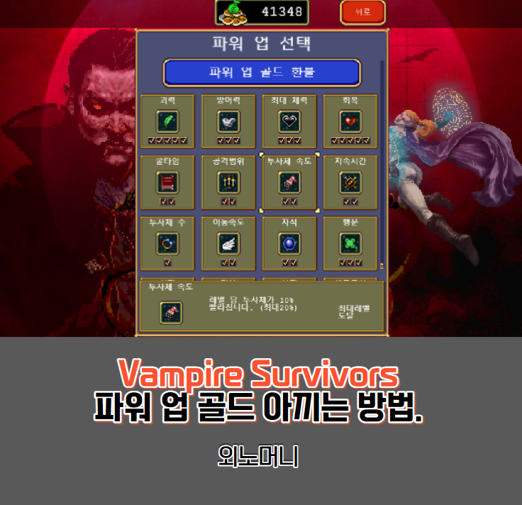 뱀파이어 서바이버즈(Vampire Survivors) 파워 업 골드 아끼는 방법. (최소 골드 루트)