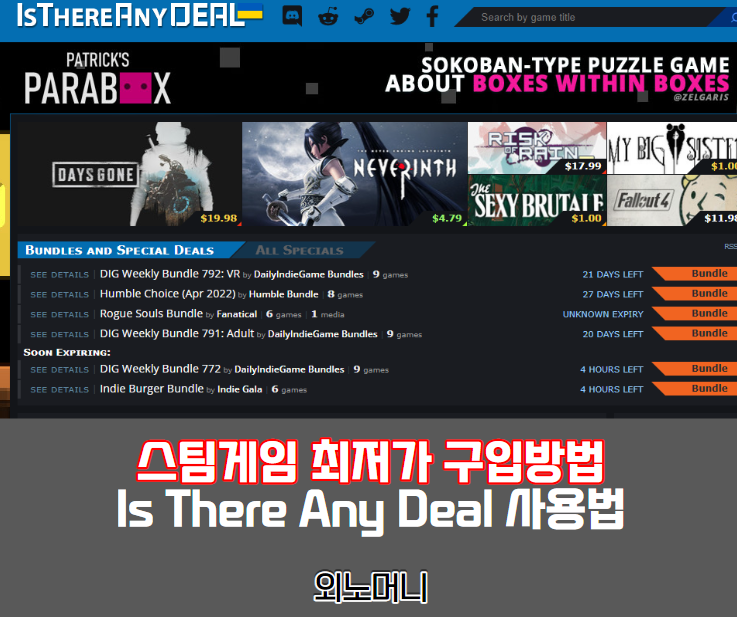 스팀 게임을 즐겨 하시는 분들은 세일기간이 항상 기다려지실 텐데요! 하지만 세일기간마다 모든게임을 세일을 하는 것이 아니라 내가 원하는 게임이 세일을 하지 않는다면 더 오랜기간 기다려야 하는 단점이 있습니다. 이런 단점을 해소시켜줄 사이트를 소개해 드리겠습니다. 바로 Is There Any Deal이라는 사이트 인데요! 스팀에서 사용가능하지만 스팀 외에 다른 플랫폼에서 판매하는 게임들의 가격을 비교해주는 사이트이고 가장 싼 가격에 게임을 구입할 수 있는 사이트입니다. 한번 자세하게 알아볼까요?