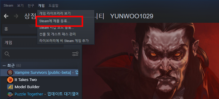 게임->Steam에 제품 등록을