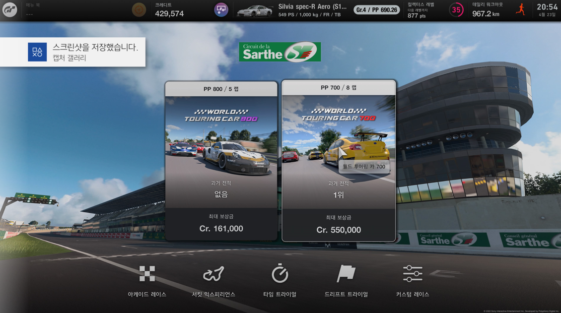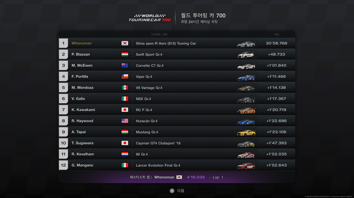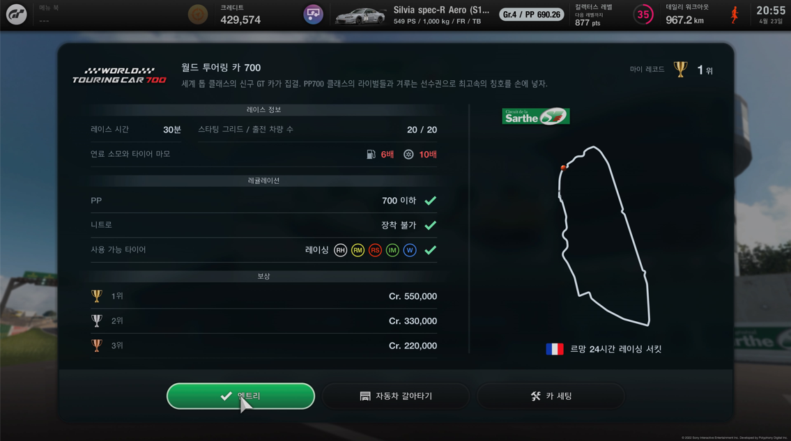 이번 그란투리스모7 1.13패치로 토마호크 X VGT를 이용한 크레딧 앵벌 방법이 막히면서 새로운 크레딧 앵벌을 찾는 분들을 위해 준비했습니다. 바로 Gr.4 등급 차량을 이용해 르망 24시간 레이싱 서킷의 월드 투어링 카 700을 무한 런 하는 방법인데요! 자세하게 한번 알아보겠습니다.