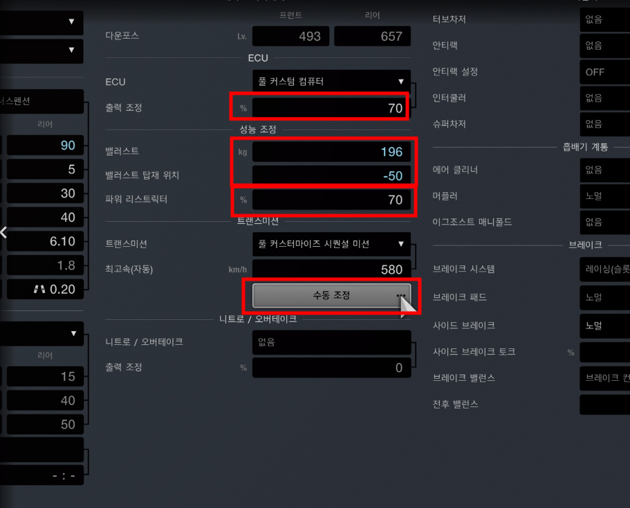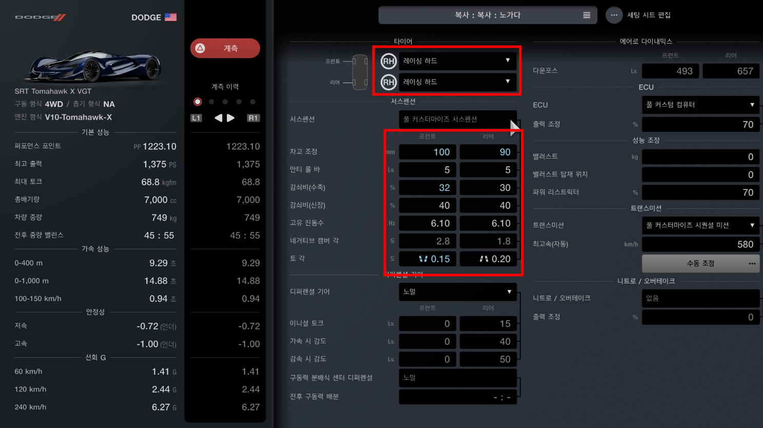 위의 사진과 같이레이싱 하드 타이어를 장착하고붉은 네모 박스안의 값과똑같이 차량의 세부세팅을 바꿔줍니다.
