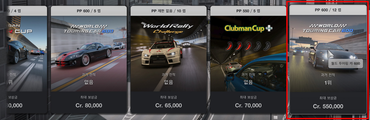 월드 서킷 -> 아시아 오세아니아 -> 도쿄 익스프레스 웨이-> 제일 오른쪽 월드 투어링카 600으로 갑니다.