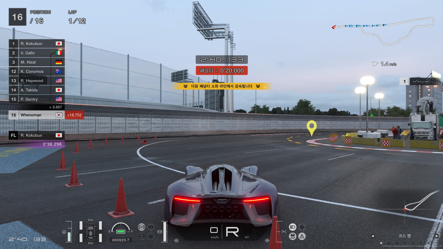 마지막 헤어핀 코너에서스핀하기 굉장히 쉽습니다.특히 속도를 줄이고재가속을 하는시점에차가 휙 돌아버리는 일이 잦은데요.기어변속을 수동으로 바꾼뒤,6~7단을 넣고 40~50Km로 돌아나가면쉽게 탈출할 수 있습니다.
