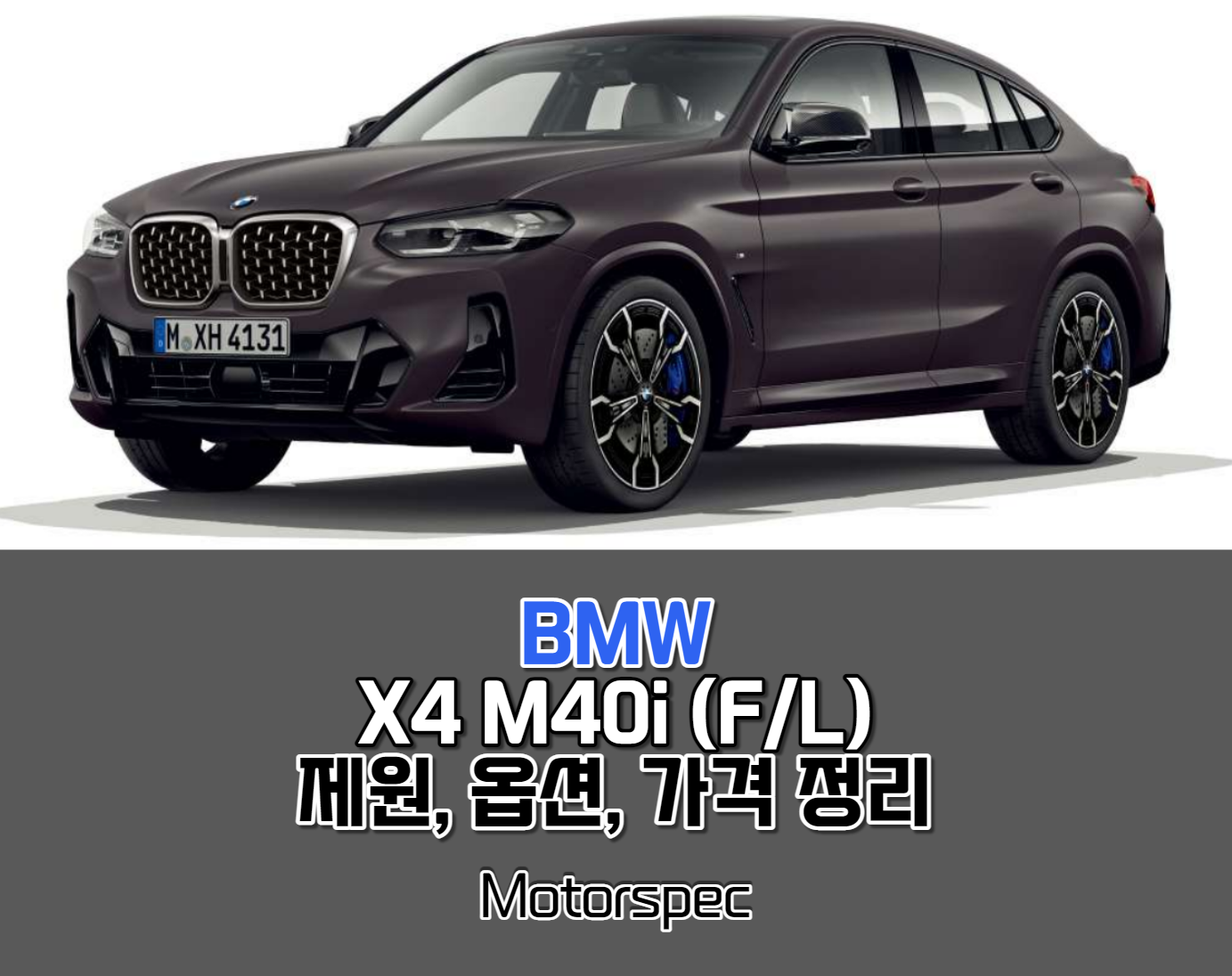 BMW의 X4는 쿠페형 중형 SUV로써 X5를 기반으로 제작된 X6가 선풍적인 인기를 얻으면서 덩달아 인기가 올라간 모델입니다. 유려한 쿠페라인과 SUV의 특징인 넓직한 뒷자석, 트렁크 공간등 실용성까지 챙긴 모델이라 아빠들의 마음을 훔치고 있는 모델인데요. 2022년 페이스리프트를 진행하면서 더욱 공격적인 범퍼디자인, 각종 편의사양강화등의 변화가 있었습니다. 2022 X4 M40i 모델은 X4 M은 너무 부담스럽고 고출력 SUV를 편안하면서도 스포티하게 운행하고 싶으신 분들에게 알맞은 차량이며 데일리카와 패밀리카로 손색없는 차량입니다. X4 M40i의 제원, 옵션, 가격등을 알아보겠습니다.