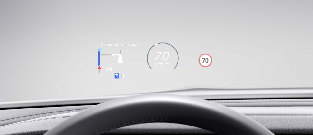 헤드업 디스플레이에는 운전자가 선택한 정보(현재 속도, 속도 제한 등)가 고해상도 및 컬러로 표시되며, 맑은 날과 어두운 밤에도 선명하게 확인할 수 있습니다. 또한, 헤드업 디스플레이의 높이를 조정하여 운전자의 시야에 알맞게 배치할 수 있으며 이를 통해 운전자는 도로와 교통 상황에 집중할 수 있습니다.