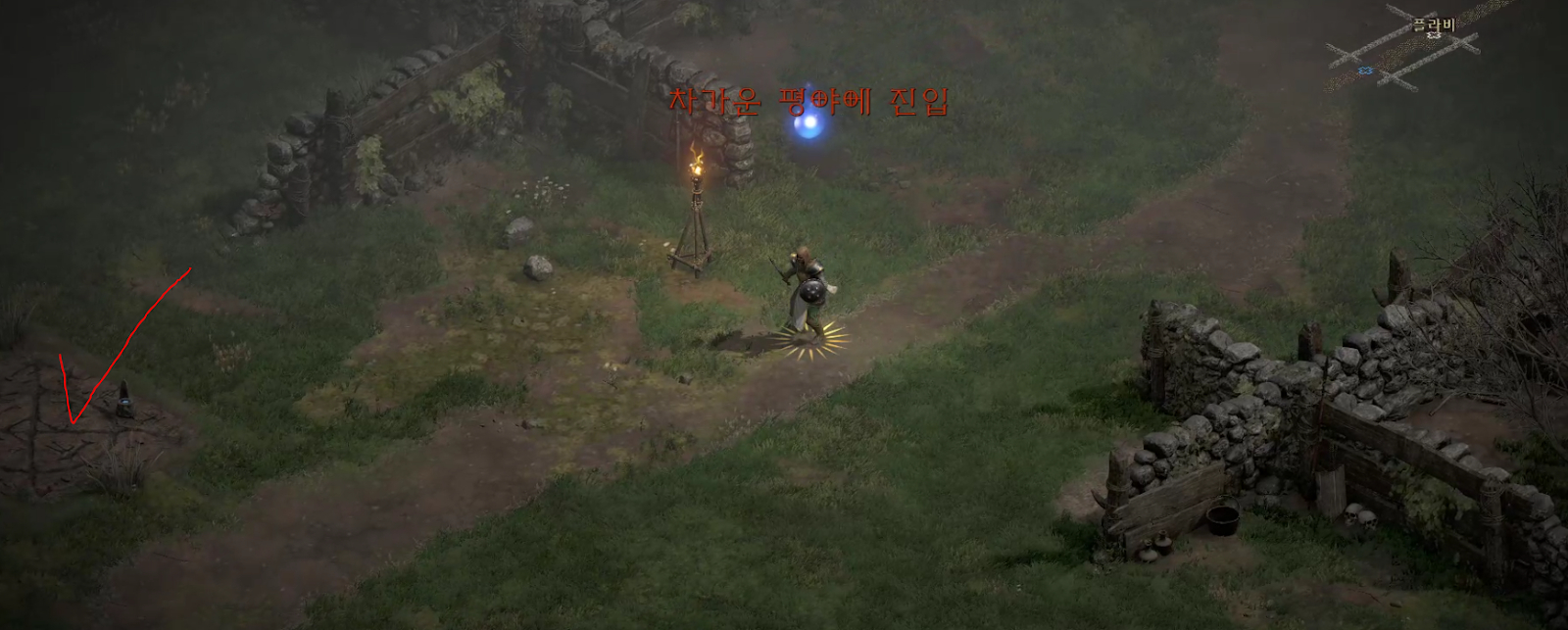 다시 핏빛 황무지를 나와 길을 따라 계속 진행하다보면 플라비라는 NPC가 보입니다. 이 NPC를 지나게 되면 차가운 평야로 진입하게 됩니다.