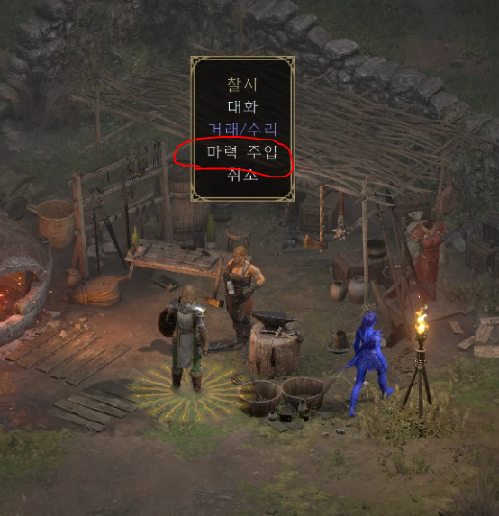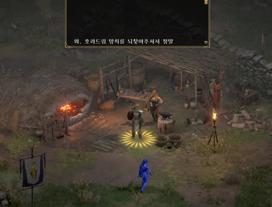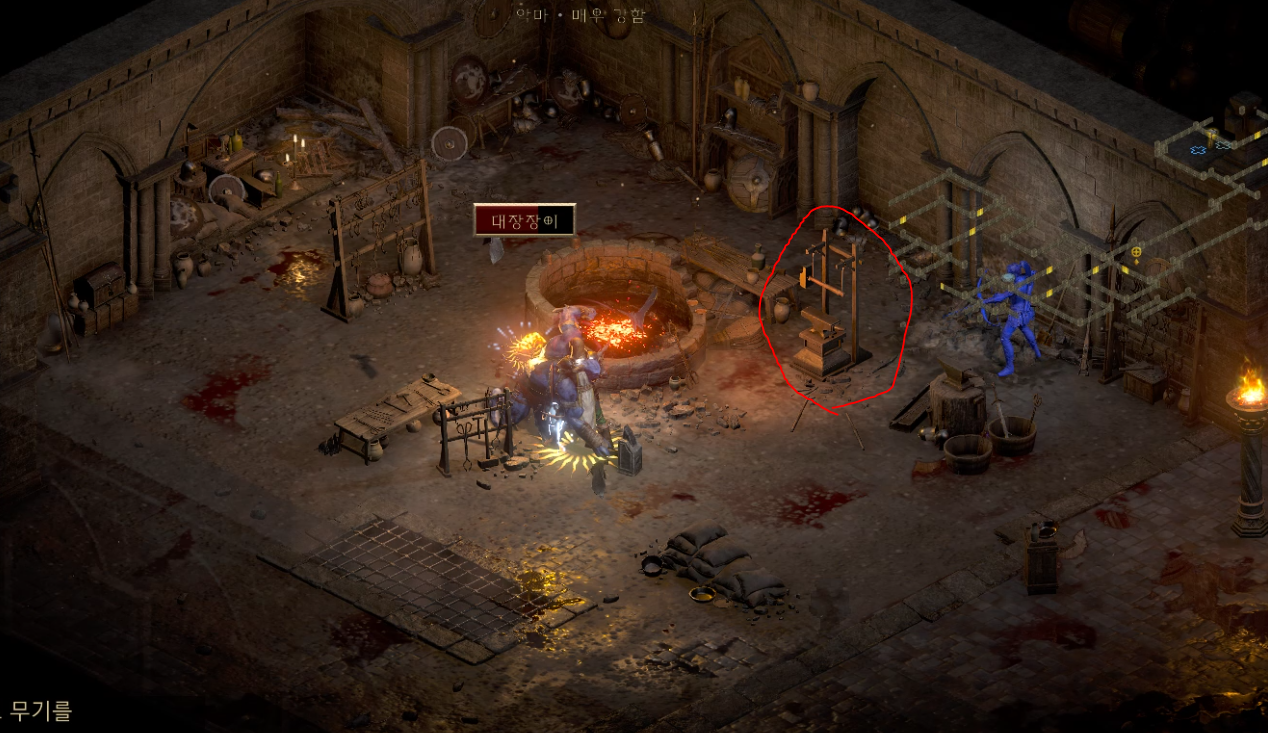 웨이포인트를 지나 계속 진행하다 보면 병영에 들어갈 수 있는데요 병영을 뒤지다 보면 대장장이라는 유니크 몬스터를 만날 수 있습니다. 이 대장장이 주변에는 받침대에 걸려있는 망치가 있습니다. 클릭해서 호라드림 망치를 얻어줍시다.