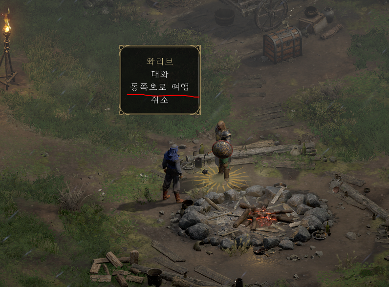 안다리엘을 처치한 뒤, 자매단 야영지의 창고 주변에 위치한 와리브에게 말을 걸어 ‘동쪽으로 여행’을 클릭하면 액트1이 마무리 됩니다.